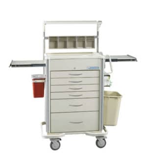 Also included is a TGB-1 Single Glove Box Holder, ensuring gloves are always within reach. Furthermore, the SSB-1 Sharps Bracket safely holds a sharps container (not included), promoting safety and compliance. The TWC-3 Waste Container (lidless) facilitates quick disposal of used items. Moreover, these accessories create a streamlined anesthesia cart setup.