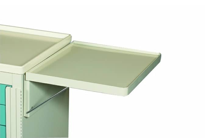 MPD Cart Accessory: Collapsible Side Shelf TSN-2. Adds valuable workspace to your Standard Series medical cart. Designed for flexibility, this shelf offers extra surface area when needed and folds down easily when not in use. Its compact size—17-3/4″ deep by 14-7/8″ wide—makes it a practical solution for tight clinical spaces.