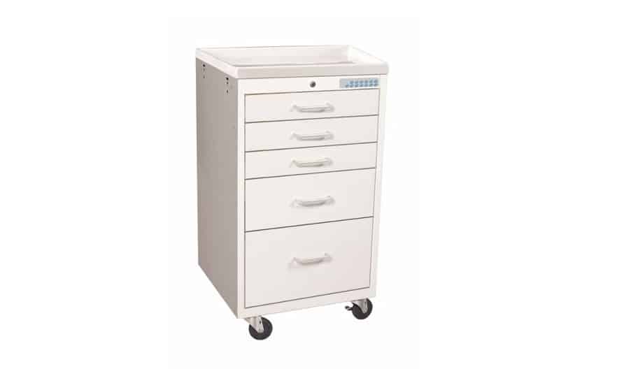 MPD MME-524-B Mini 5 Drawer Anesthesia Cart w/ Electronic Lock.The MPD MME-524-B has a slim, space-saving design with 3” swivel wheels for easy movement. It offers customizable drawers at no extra cost and comes in 17 color options, including solid and two-tone. Perfect for healthcare settings, its small size fits into tight spaces while meeting your facility’s needs.