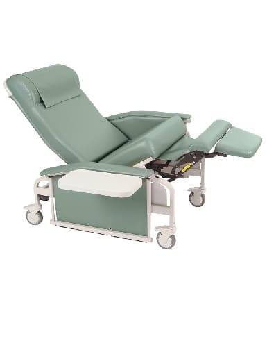 The Winco 6571XL Features: Drop Arm Care Cliner has arms that can be lowered flush with the seat to aid in patient transfer. It has non-porous blow-molded fold-down side trays on both sides. These bariatric recliners have a 450 lb weight capacity. Each chair in the Care Cliner Series features a standard Trendelenburg release with a handle accessible from either side.