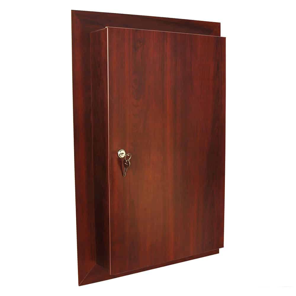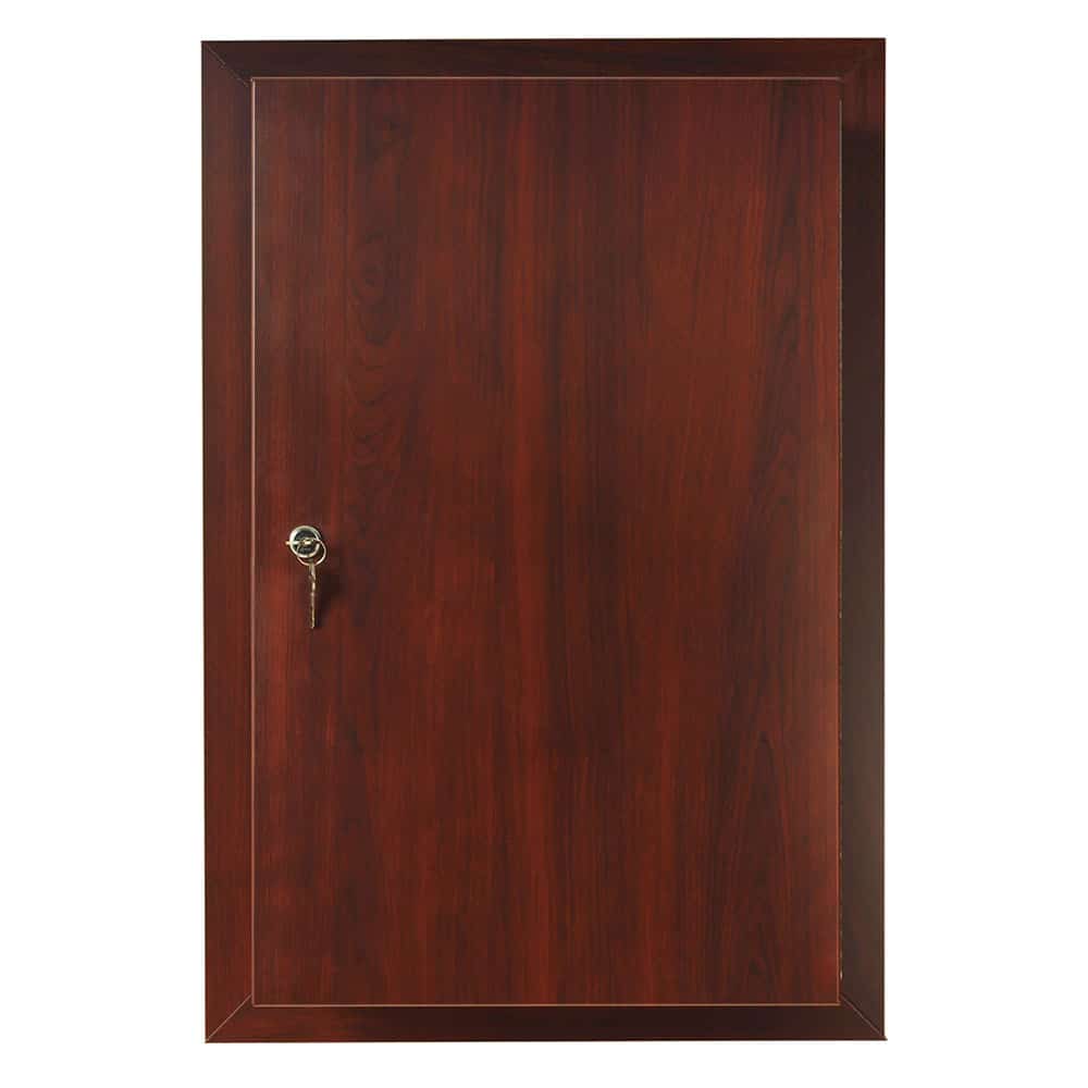 The Harloff WV2760-CM Medication Storage Cabinet is a recessed wall-mounted medication cabinet designed for both security and style. Made with powder-coated steel and a vinyl-coated aluminum door, it offers durable, tamper-resistant storage. Its natural cherry mahogany wood vinyl trim adds an attractive finish. Install this cabinet on an exterior wall or recess it between 16” on-center wooden studs for a seamless, built-in appearance in resident rooms.