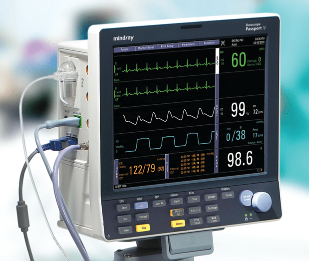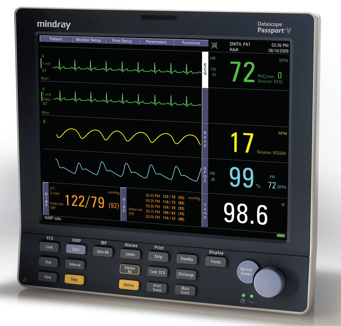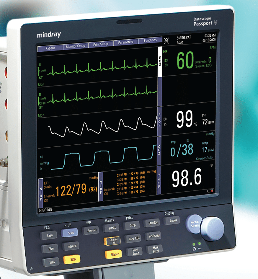 Mindray Datascope Passport V Patient Monitor – Refurbished. The Mindray Datascope Passport V is perfect for most departments in an ASC or hospital. Furthermore, it features a 12.1” color LCD screen and a battery backup for continuous monitoring. Additionally, the multi-parameter monitor includes ECG, NIBP, RESP, SpO2, Temp, and an internal thermal recorder, providing essential data for patient care.