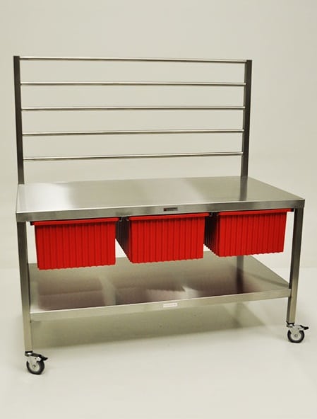 MCM Central Sterile Instrument Wrapping Station: MCM 596.  Mid Central Medical delivers dependable solutions for sterile processing with the MCM 596. Built with a stainless steel top and upper rack, it provides a strong, stable surface for wrapping instruments in clean, controlled environments. The ergonomic 35″ work height reduces strain on staff, making long tasks more comfortable and efficient in high-demand healthcare settings.