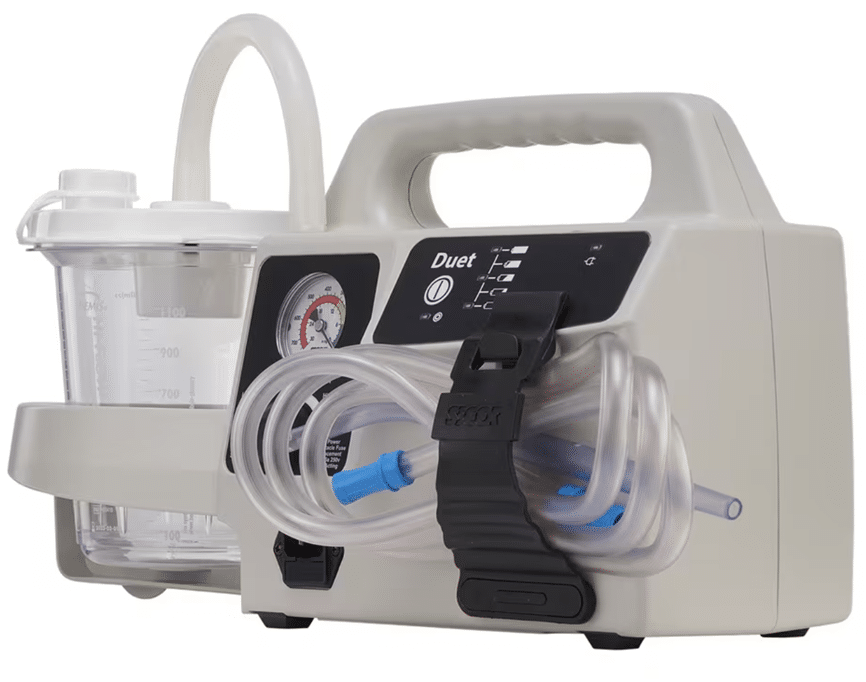The Duet 2314 is designed for quick setup and ease of use in urgent situations. Furthermore, each unit includes a canister, patient tube,  power cord, and Quickstart Guide. Moreover, durable, lightweight design supports mobility and dependable performance under pressure.