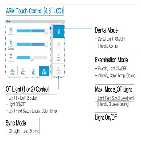 Additionally, the 54 LEDs in each light head produce up to 120,000 lux in a pattern that can be adjusted from 7.8” to 11.8”. The Luvis Surgical Light includes a synchronized control panel on the sub-handle for easy access during surgery.