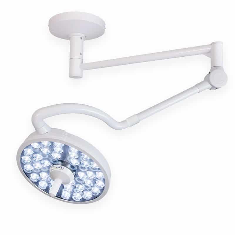 Medical Illumination MI-1000 LED Surgical Light Single Ceiling Mount. The MI-1000 LED Surgical Light from Medical Illumination features exceptional quality, energy-efficient operation, and cool, bright output.  It provides a white, bright light from multiple LED spots, thus enabling excellent shadow control.