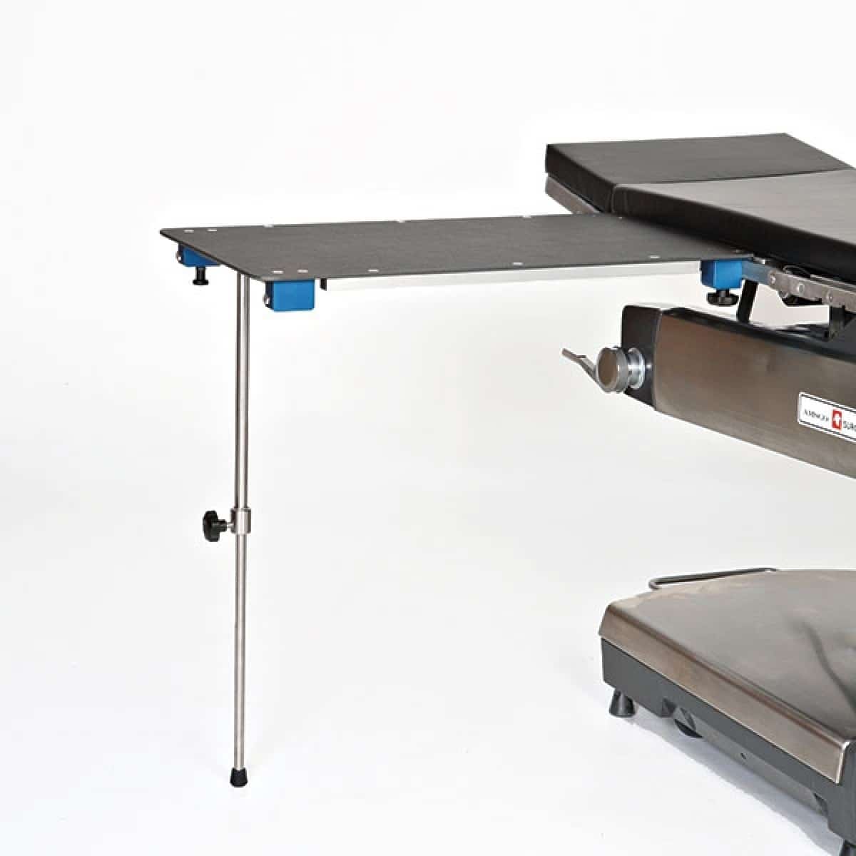 The MCM 310 features a single post leg and includes a comfortable 2″ thick pad for patient support. Its operating surface is designed to accommodate a wide range of arm and hand procedures, with adjustable leg support for versatility. Reinforced aluminum bars along the outer edges provide added strength and stability during surgery.