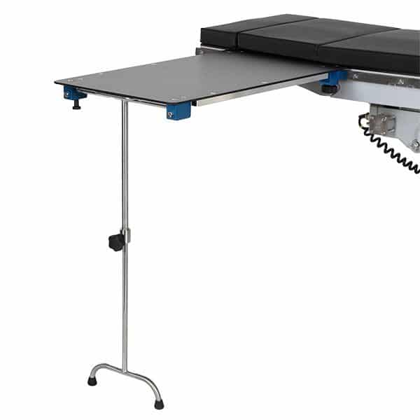 Additionally, this table secures firmly to the operating table using MCM’s exclusive Posi-Lock Clamps. These clamps prevent movement during procedures, ensuring maximum safety and workflow efficiency. An adjustable leg provides added customization to meet specific surgical requirements.