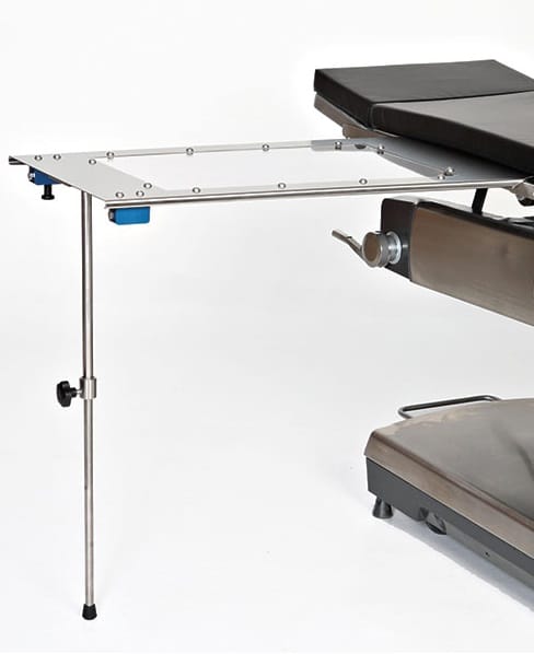 Under Pad Mount Arm and Hand Surgery Table MCM 340 Features: A Single Post Leg and 2″ thick Pad. A very durable table offering a Polycarbonate Covered Opening which measures 14″ wide by 24″ long for C-Arm Access. The rugged stainless steel construction ensures long-term use and is designed to slip under the pad, so the patient won’t even feel it.